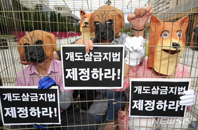 [서울=뉴시스] 박민석 기자 = 중복인 26일 서울 종로구 광화문광장 이순신 장군 동상 앞에서 비건 세상을 위한 시민모임 회원들이 기자회견을 열고 개도살 금지법 제정을 촉구하는 퍼포먼스를 하고 있다. 2020.07.26.