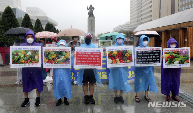 [서울=뉴시스]최진석 기자 = 비건 세셍을 위한 시민모임(비시모) 회원들이 2일 서울 광화문 광장에서 '만병의 근원 육식을 중단, 건강 채식 촉구 기자회견'을 하고 있다. 2020.08.02.