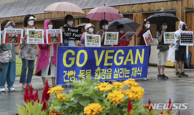[서울=뉴시스]최진석 기자 = 비건 세셍을 위한 시민모임(비시모) 회원들이 2일 서울 광화문 광장에서 '만병의 근원 육식을 중단, 건강 채식 촉구 기자회견'을 하고 있다. 2020.08.02.