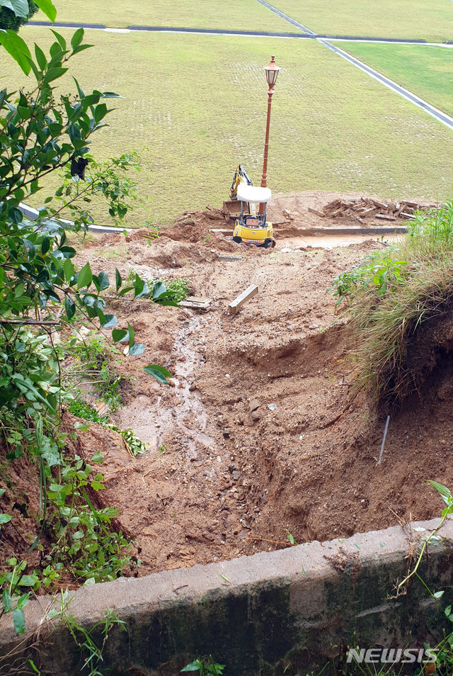 [광주=뉴시스] 변재훈 기자 = 10일 광주 북구 운정동 국립5·18민주묘지 2묘역 왼편 내 경사지에서 복구 작업이 진행 중이다. 앞서 기록적인 폭우가 내린 지난 8일 빗물에 쓸린 토사 10여t이 2묘역 내에 흘러 내렸다. (사진=국립5·18민주묘지관리사무소 제공) 2020.08.10.