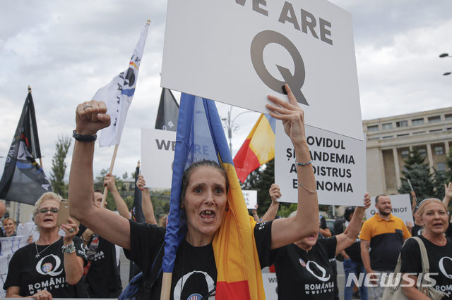 [부쿠레슈티=AP/뉴시스]10일(현지시간) 루마니아 부쿠레슈티에서 루마니아 '큐아논'(QAnon) 지지자들이 마스크 착용 등 코로나19 확산을 막기 위한 정부의 조치에 반대하는 구호를 외치며 시위하고 있다. 큐아논은 트럼프 지지자 집단 중 하나로 음모론자들이 주체로 돼 있다. 2020.08.11.