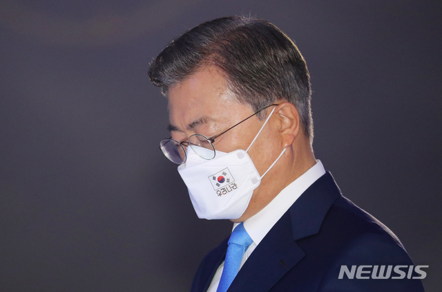 [서울=뉴시스]배훈식 기자 = 문재인 대통령이 15일 서울 중구 동대문디자인플라자에서 열린 제75주년 광복절 경축식에 참석해 국민의례를 하고 있다. 2020.08.15.