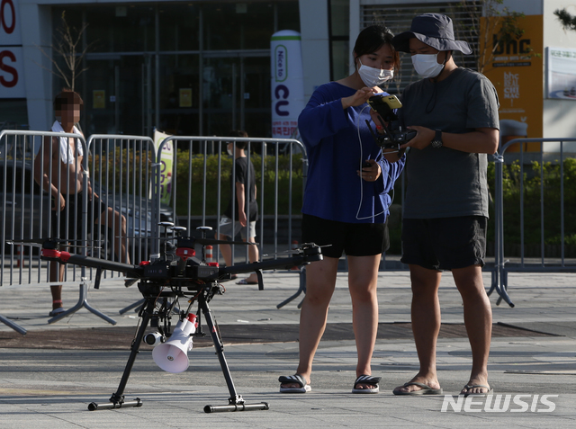 [강릉=뉴시스] 김경목 기자 = 강릉시 위탁업체 에어블루(AIR BLUE) 관계자들이 23일 오후 강원 강릉시 경포해수욕장에서 신종 코로나바이러스 감염증(코로나19) 확산 예방을 위한 생활방역 수칙 홍보와 마스크 미착용자를 발견하기 위해 드론을 올릴 준비를 하고 있다. 영국의 공영방송 BBC는 강릉 경포해수욕장에서 한국의 코로나19 예방 선진 사례를 소개했다. 2020.08.23.