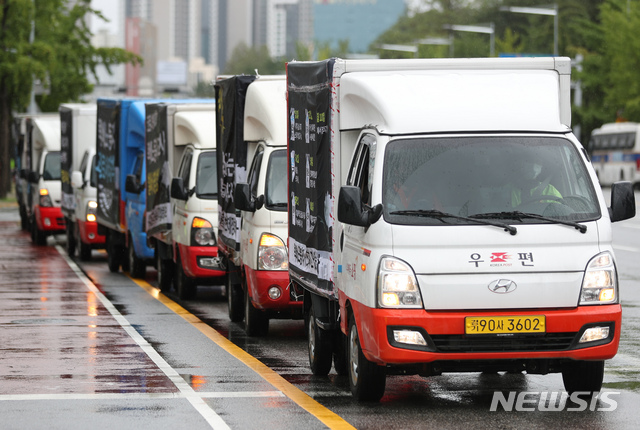 [서울=뉴시스] 고승민 기자 = 택배노동자 과로사대책위원회, 전국택배연대노조 소속 택배회사 차량이 7일 서울 여의도 국회대로에서 과로로 사망한 7명의 택배노동자를 추모하며 정부서울청사를 향해 행진하고 있다. 2020.09.07.