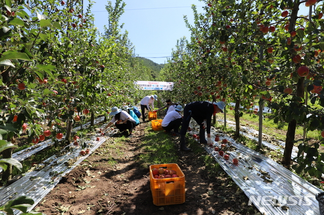 [포항=뉴시스] 강진구 기자 = 경북도 출연기관인 독도재단 자원봉사단은 14일 오전 포항시 북구 죽장면 한 과수농가를 찾아 제10호 태풍 ‘하이선’으로 발생한 피해복구 지원에 구슬땀을 흘렸다.(사진=독도재단 제공) 2020.09.14.