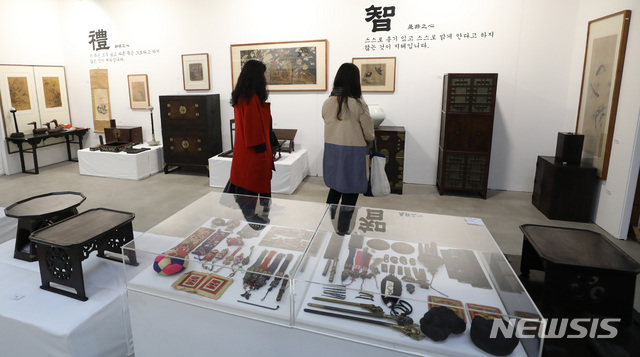[서울=뉴시스] 조수정 기자 = 2020 인사동 문화축제 X 아시아 호텔 아트페어 서울 2020이 열린 16일 오후 서울 종로구 인사동 센트럴뮤지엄에서 관람객들이 작품을 보고 있다. 2020.10.16.