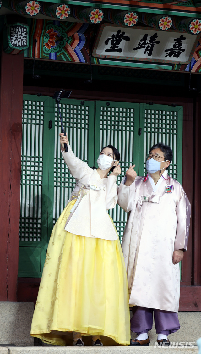 [서울=뉴시스] 박미소 기자 = 박양우(왼쪽) 문화체육관광부 장관이 16일 오후 서울 종로구 창경궁 가정당에서 열린 한복문화주간 영상공모전 시상식 및 한복홍보대사 위촉식에서 배우 권나라 씨에게 위촉장을 전달한 후 기념촬영을 하고 있다.(사진=문화체육관광부 제공) 2020.10.16.