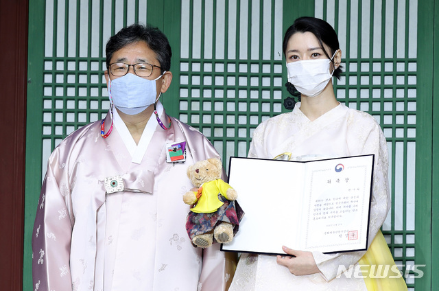 [서울=뉴시스] 박미소 기자 = 박양우(왼쪽) 문화체육관광부 장관이 16일 오후 서울 종로구 창경궁 가정당에서 열린 한복문화주간 영상공모전 시상식 및 한복홍보대사 위촉식에서 배우 권나라 씨에게 위촉장을 전달한 후 기념촬영을 하고 있다.(사진=문화체육관광부 제공) 2020.10.16.