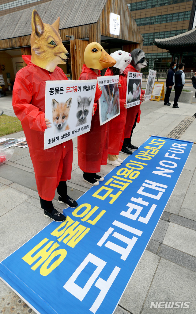 [서울=뉴시스]김병문 기자 = 비건세상을위한시민모임 활동가들이 21일 오후 서울 종로구 광화문광장에서 열린 모피, 다운 반대 기자회견에 참석해 동물 가면을 쓰고 반대 퍼포먼스하고 있다. 2020.10.21.