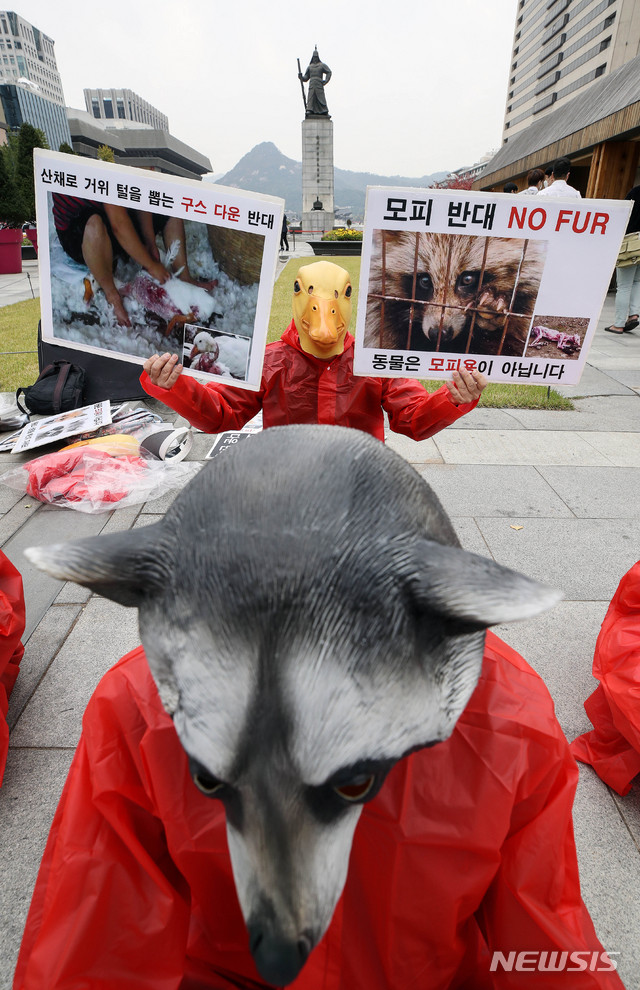 [서울=뉴시스]김병문 기자 = 비건세상을위한시민모임 활동가들이 21일 오후 서울 종로구 광화문광장에서 열린 모피, 다운 반대 기자회견에 참석해 동물 가면을 쓰고 반대 퍼포먼스하고 있다. 2020.10.21.
