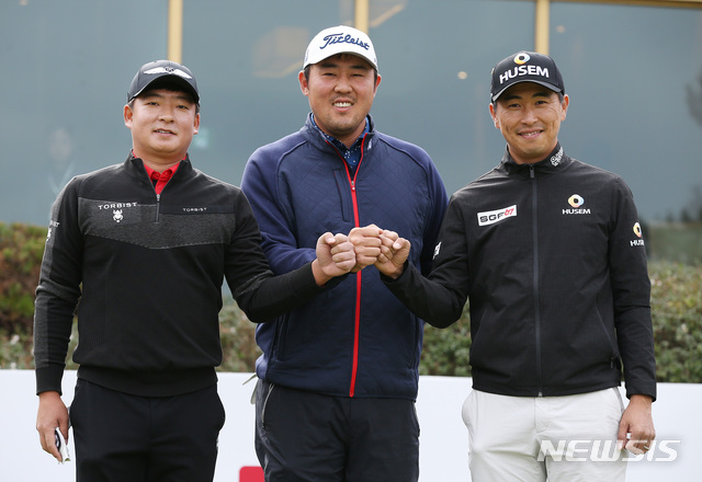 [서울=뉴시스]박주성 기자 = 25일 제주도 애월읍 소재 타미우스 골프앤 빌리지에서  비즈플레이 전자신문 오픈 with 타미우스 CC FR에서 김승혁(왼쪽부터), 이원준, 문경준 선수가 1번홀 티그라운드 출발 전 파이팅 포즈를 하고 있다. (사진=KPGA 제공). 2020.10.25.