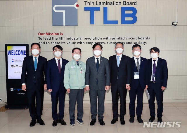 [서울=뉴시스]박주성 기자 = 성윤모 산업통상자원부 장관은 27일 경기도 안산시 단원구에 위치한 디지털 기반 제조혁신 우수기업(반도체용 PCB 생산업체)인 ㈜티엘비에서 김정환 산업단지공단 이사장, 박건수 산업기술대 총장, 조 석 현대일렉트릭 대표 등 관계자가 참석한 가운데 백성현 티엘비 대표로부터 회사소개와 3D 프린터 설계연구소 등 주요시설을 둘러보고 현장근무자들을 격려하였다. (사진=산업통상자원부 제공). 2020.10.27.