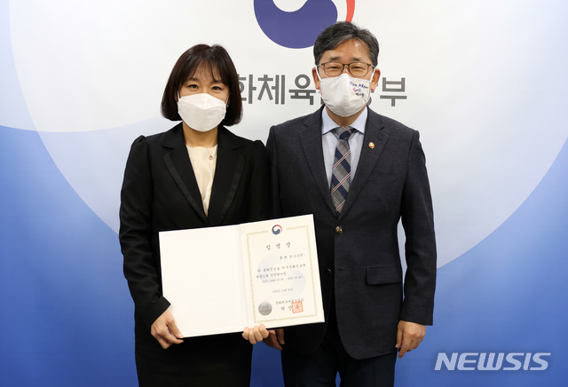 [서울=뉴시스]박주성 기자 = 박양우 문화체육관광부 장관이 30일 서울 용산구 문체부스마트워크센터 회의실에서 신임 홍희경 한국문화정보원장에게 임명장을 수여한 뒤 기념촬영을 하고 있다. (사진=문화체육관광부 제공). 2020.10.30.