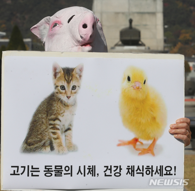 [서울=뉴시스]김명원 기자 = '세계 비건(Vegan)의 날'을 맞아 30일 서울 종로구 광화문 광장 이순신 동상 앞에서 '비건 세상을 위한 시민모임(비시모)', '한국채식연합' 등 닭가면 동물가면과 복장을 한 참석자들이 '비건 채식을 촉구'하는 퍼포먼스 기자회견을 하고 있다. 2020.10.30.