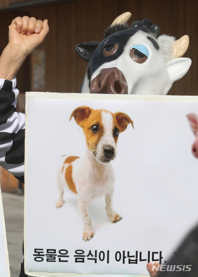 [서울=뉴시스]김명원 기자 = '세계 비건(Vegan)의 날'을 맞아 30일 서울 종로구 광화문 광장 이순신 동상 앞에서 '비건 세상을 위한 시민모임(비시모)', '한국채식연합' 등 닭가면 동물가면과 복장을 한 참석자들이 '비건 채식을 촉구'하는 퍼포먼스 기자회견을 하고 있다. 2020.10.30.