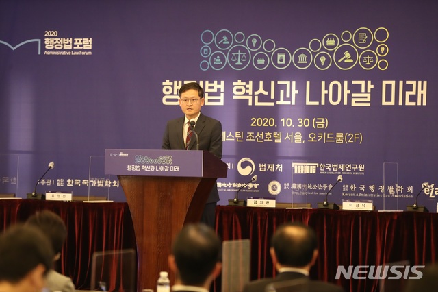 [서울=뉴시스]박주성 기자 = 한국법제연구원(원장 김계홍)은 법제처(처장 이강섭)와 공동으로 30일 웨스틴 조선 서울 호텔 오키드룸(2F)에서 ‘행정법의 혁신과 나아갈 미래’를 주제로 「2020 행정법 포럼」을 개최했다. (사진=한국법제연구원 제공). 2020.10.30.