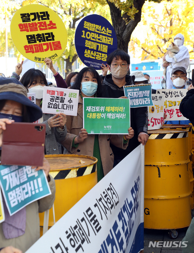 [서울=뉴시스]박영태 기자 = 탈핵 및 환경 관련 시민사회단체 회원들이 2일 오후 서울 종로구 청운동사무소 앞에서 '대한민국 방방곡곡 가져가라 핵폐기물' 기자회견을 하고 있다. 이들은 당초 청와대 앞 분수대광장에서 행사를 할 예정이었지만 경찰의 제지로 청운동사무소 앞에서 기자회견을 진행했다. 2020.11.02.