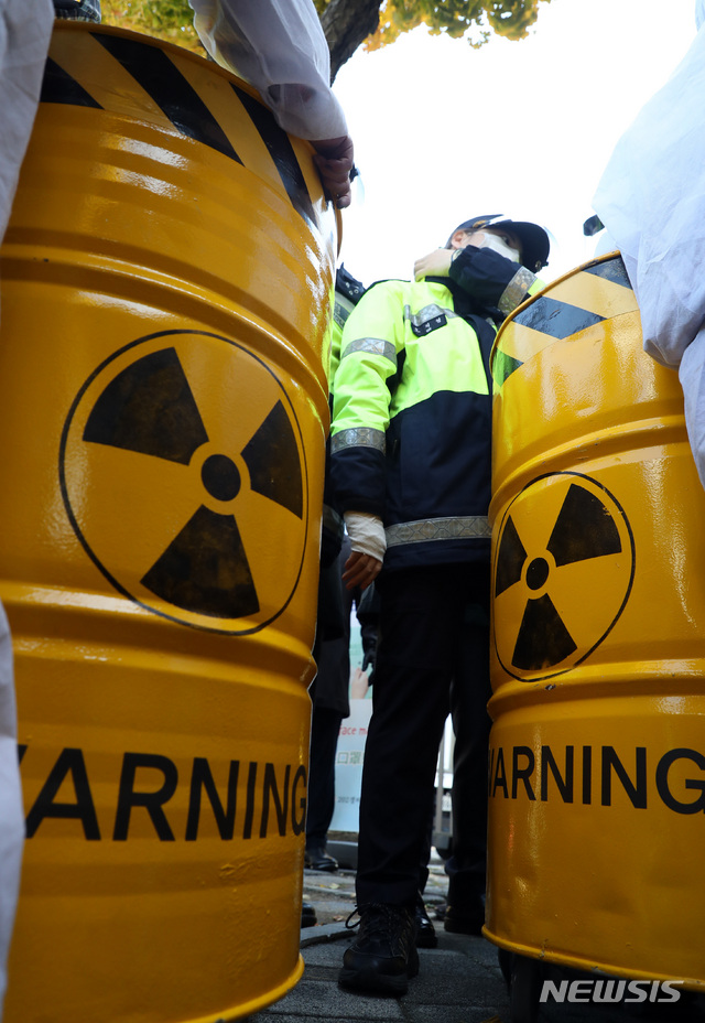 [서울=뉴시스]박영태 기자 = 탈핵 및 환경 관련 시민사회단체 회원들이 2일 오후 서울 종로구 청와대 분수대 앞에서 '대한민국 방방곡곡 가져가라 핵폐기물' 기자회견을 위해 이동하다 청운동 동사무소 앞에서 경찰에 막히고 있다. 이들은 당초 청와대 앞 분수대광장에서 기자회견을 할 예정이었지만 경찰의 제지로 청운동사무소 앞에서 기자회견을 진행했다. 2020.11.02.