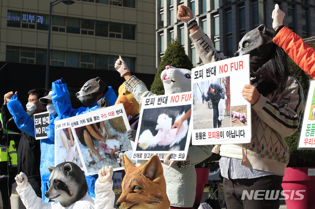 [서울=뉴시스] 박민석 기자 = 비건 세상을 위한 시민모임, 한국동물보호연합 회원들이 3일 오후 서울 종로구 광화문광장에서 '모피, 다운 반대 퍼포먼스 기자회견'을 열고 있다. 2020.11.03.
