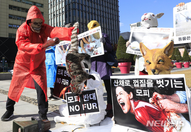 [서울=뉴시스] 박민석 기자 = 비건 세상을 위한 시민모임, 한국동물보호연합 회원들이 3일 오후 서울 종로구 광화문광장에서 열린 '모피, 다운 반대 퍼포먼스 기자회견'에서 모피를 반대하는 내용을 담은 퍼포먼스를 하고 있다. 2020.11.03.