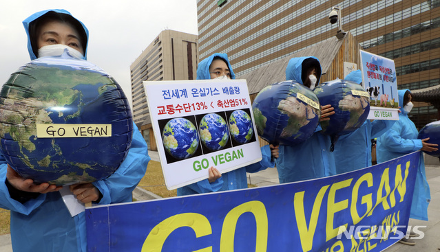[서울=뉴시스]최진석 기자 = 유엔(UN)이 정한 세계환경착취 예방의 날인 6일 서울 광화문 광장에서 비건 세상을 위한 시민모임 회원들이 '비건 채식을 촉구하는 기자회견'을 하며 축산업과 육류산업이 환경파괴의 주범이라고 주장하고 있다. 2020.11.06.