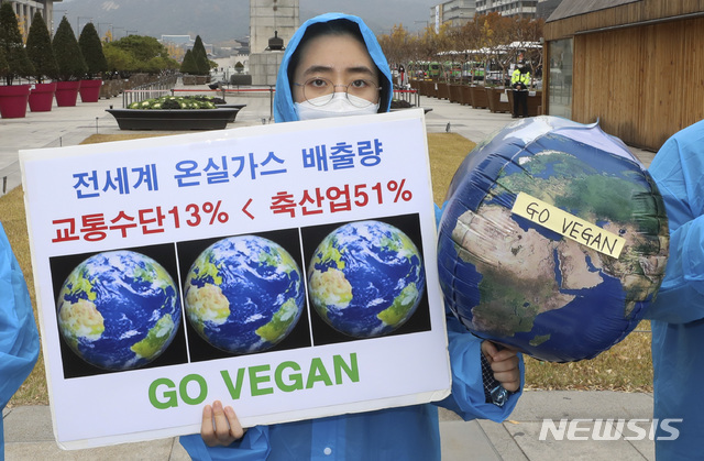 [서울=뉴시스]최진석 기자 = 유엔(UN)이 정한 세계환경착취 예방의 날인 6일 서울 광화문 광장에서 비건 세상을 위한 시민모임 회원들이 '비건 채식을 촉구하는 기자회견'을 하며 축산업과 육류산업이 환경파괴의 주범이라고 주장하고 있다. 2020.11.06.