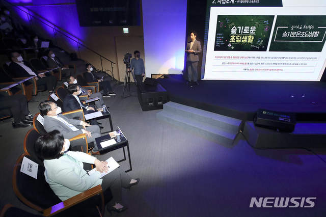 [서울=뉴시스]KT가 중소벤처기업부, 경기창조경제혁신센터와 함께 16일 오후 서울 광화문 KT 스퀘어에서 ‘대-스타 해결사 플랫폼’ 제1탄의 결승전을 열고 3개의 스타트업을 최종 선발했다. 사진은 이너테인먼트 허민강 대표가 최종 프리젠테이션을 하고 있는 모습. (사진=KT 제공) 2020.11.17.