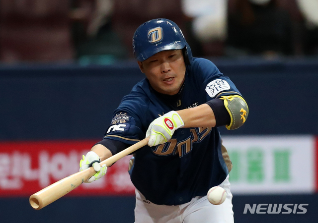 [서울=뉴시스]배훈식 기자 = 21일 오후 서울 구로구 고척스카이돔에서 열린 2020 KBO 한국시리즈 4차전 두산 베어스와 NC 다이노스의 경기, 7회초 1사 1루 상황에서 NC 지석훈이 희생번트를 하고 있다. 2020.11.21.