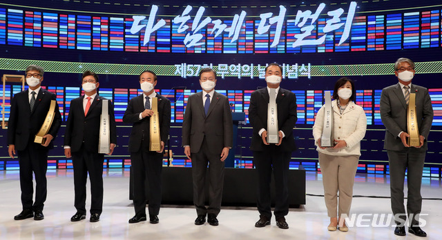 [서울=뉴시스]추상철 기자 = 문재인 대통령이 8일 오전 서울 강남구 코엑스에서 열린 '제57회 무역의 날 기념식'에 참석해 수출의 탑 수여후 기념촬영을 하고 있다. 왼쪽부터 이기섭 비트망고 대표이사, 김준석 에이디테크놀로지 사장, 전영현 삼성SDI 대표이사, 문 대통령, 민동욱 엠씨넥스 대표이사, 이명화 한국카본 대표, 김종철 멕아이씨에스 대표이사. 2020.12.08. [email protected]