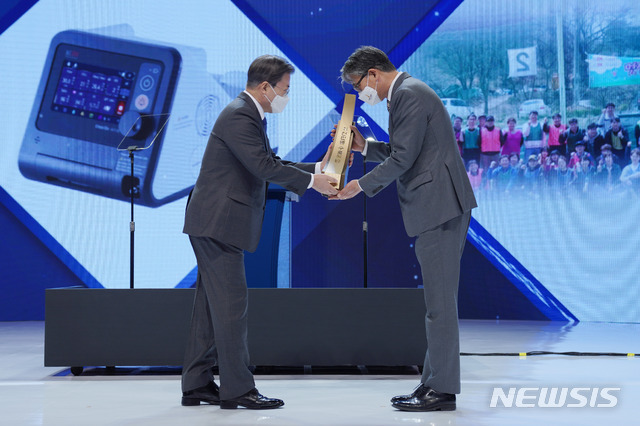 [서울=뉴시스]추상철 기자 = 문재인 대통령이 8일 오전 서울 강남구 코엑스에서 열린 '제57회 무역의 날 기념식'에 참석해 김종철 멕아이씨에스 대표이사에게 2천만불 수출의 탑을 수여하고 있다. 2020.12.08. [email protected]