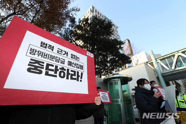 [서울=뉴시스] 이윤청 기자 = 평화와통일을여는사람들(평통사) 관계자들이 9일 서울 종로구 외교부 앞에서 방위비분담금 불법 집행 규탄 기자회견을 열고 발언하고 있다. 2020.12.09. [email protected]