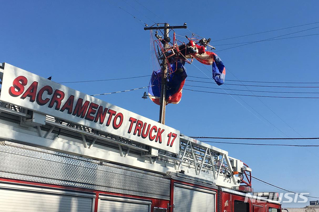 [리오린다=AP/뉴시스]20일(현지시간) 미 캘리포니아주 리오 린다에서 어린이들에게 사탕 등을 배달하기 위해 동력 낙하산을 타고 날던 산타클로스 복장의 한 남성이 전선에 걸려 있다. 이 남성은 다치지 않고 구조됐으며 연방항공청 대변인은 이 남성이 리오 린다의 한 학교 부근에서 이륙한 후 전선과 부딪히면서 인근에 정전이 발생했다고 밝혔다. 2020.12.22.