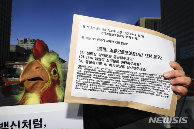 [서울=뉴시스] 박민석 기자 = 한국동물보호연합 회원이 5일 오후 서울 종로구 광화문 이순신동상 앞에서 조류인플루엔자(AI) 예방적 살처분 중단을 촉구하는 피켓 시위를 하고 있다. 2021.01.05. [email protected]