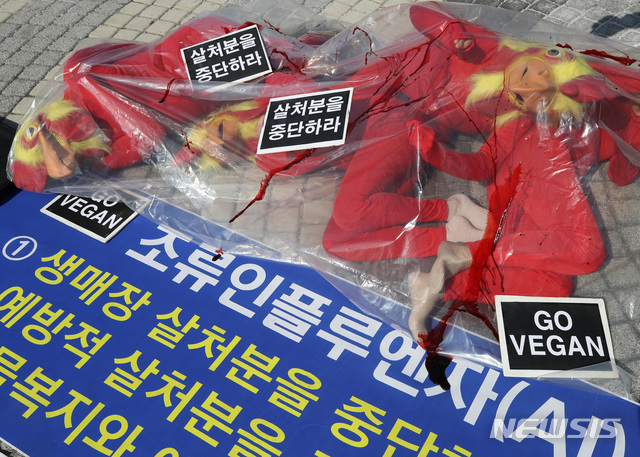 [서울=뉴시스]조수정 기자 = 한국동물보호연합 등 시민단체 회원들이 23일 오후 서울 종로구 청와대 분수대 앞에서 조류인플루엔자(AI) 생매장 예방적 살처분 중단, 동물복지와 AI 예방백신 실시, 채식 촉구 기자회견을 열고 퍼포먼스 하고 있다. 2021.02.23. [email protected]
