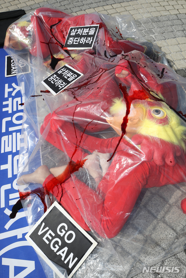 [서울=뉴시스]조수정 기자 = 한국동물보호연합 등 시민단체 회원들이 23일 오후 서울 종로구 청와대 분수대 앞에서 조류인플루엔자(AI) 생매장 예방적 살처분 중단, 동물복지와 AI 예방백신 실시, 채식 촉구 기자회견을 열고 퍼포먼스 하고 있다. 2021.02.23. [email protected]