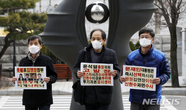 [서울=뉴시스]홍효식 기자 = 투기자본감시센터 회원들이 4일 오전 서울 서초구 대검찰청 앞에서 신현수 대통령비서실 민정수석을 직권남용 등 혐의로 고발하기 위해 민원실로 향하고 있다. 2021.03.04. [email protected]