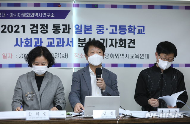 [서울=뉴시스]이윤청 기자 = 이신철 아시아평화와역사교육연대 상임공동운영위원장이 30일 서울 종로구 아시아평화와역사교육연대 사무실에서 열린 2021 검정 통과 일본 중·고등학교 사회과 교과서 분석 기자회견에서 분석 결과를 발표하고 있다. 2021.03.30. [email protected]