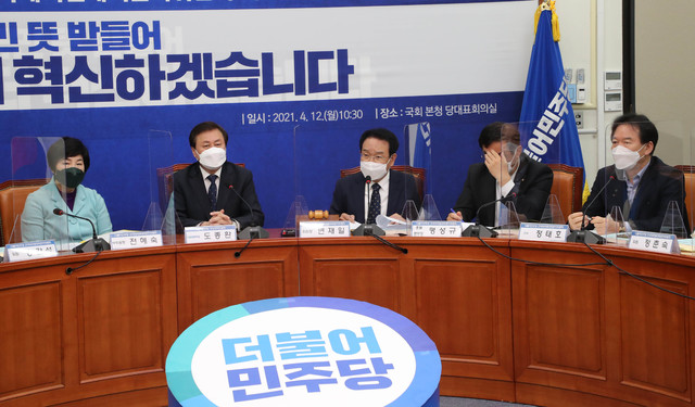 [서울=뉴시스]전진환 기자 = 변재일 더불어민주당 임시전국대의원대회준비위원회 위원장이 12일 오전 서울 여의도 국회 당 대표 회의실에서 열린 임시전국대의원대회준비위원회 1차회의에서 발언을 하고 있다.  (공동취재사진) 2021.04.12. [email protected]