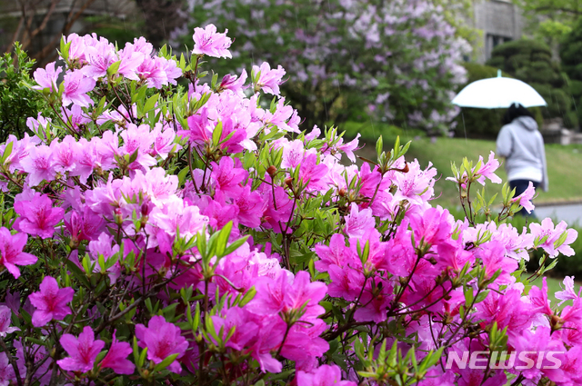 [서울=뉴시스]조수정 기자 = 봄비가 촉촉히 내린 12일 오후 서울 서대문구 이화여자대학교 교정에서 학생들이 우산을 들고 진달래와 철쭉 꽃길을 걸어가고 있다. 2021.04.12. [email protected]