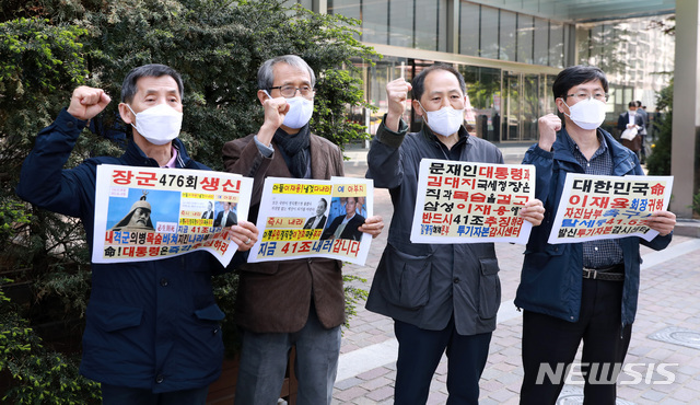 [서울=뉴시스]이영환 기자 = 투기자본감시센터 관계자들이 19일 오전 서울 강남구 삼성전자 서초사옥 앞에서 이재용 회장에게 탈세금 등 41조원 자진납부를 촉구하고 있다. 2021.04.19. [email protected]