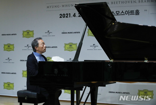[서울=뉴시스]조수정 기자 = 피아니스트 정명훈이 22일 오후 서울 서초구 코스모스아트홀에서 피아노 앨범 발매 및 공연 기자간담회를 마친 뒤 슈만의 아라베스크를 연주하고 있다. 2021.04.22. [email protected]