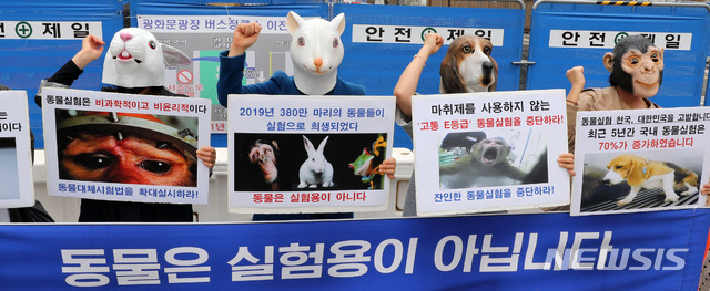 [서울=뉴시스]박주성 기자 = 한국동물보호연합과 비건세상을위한시민모임 회원들이 24일 오후 서울 광화문 이순신 동상 앞에서 '세계 실험동물의 날'을 맞아 동물실험 중단을 촉구하는 퍼포먼스를 하고 있다. 2021.04.24. [email protected]