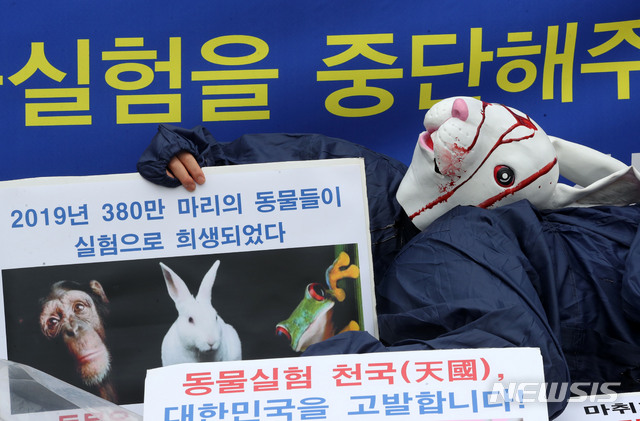 [서울=뉴시스]박주성 기자 = 한국동물보호연합과 비건세상을위한시민모임 회원들이 24일 오후 서울 광화문 이순신 동상 앞에서 '세계 실험동물의 날'을 맞아 동물실험 중단을 촉구하는 퍼포먼스를 하고 있다. 2021.04.24. [email protected]