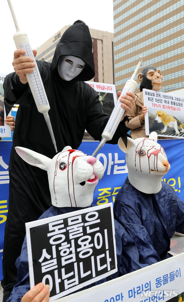 [서울=뉴시스]박주성 기자 = 한국동물보호연합과 비건세상을위한시민모임 회원들이 24일 오후 서울 광화문 이순신 동상 앞에서 '세계 실험동물의 날'을 맞아 동물실험 중단을 촉구하는 퍼포먼스를 하고 있다. 2021.04.24. [email protected]
