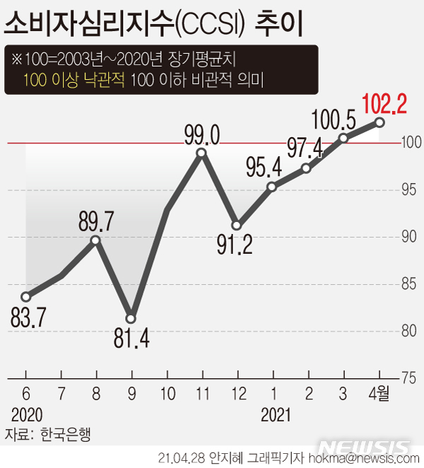 [서울=뉴시스] 28일 한국은행에 따르면 4월 소비자심리지수(CCSI)는 102.2로 전월대비 1.7포인트 상승했다. (그래픽=안지혜 기자)