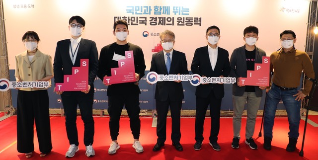 [서울=뉴시스]권칠승 중소벤처기업부 장관이 28일 서울 역삼동에 위치한 팁스타운에서 열린 '팁스 창업기업과 운영사 대표와의 간담회'에 참석해 기념촬영을 하고 있다. 왼쪽부터 유수연 테코플러스 대표, 고정욱 핏펫대표, 장영준 뤼이드 대표, 권칠승 장관, 목승환 서울대학교기술지주 대표, 곽태일 팜스킨 대표, 김재진 이오플로우 대표. (사진=중소벤처기업부 제공) 2021.04.28. [email protected]