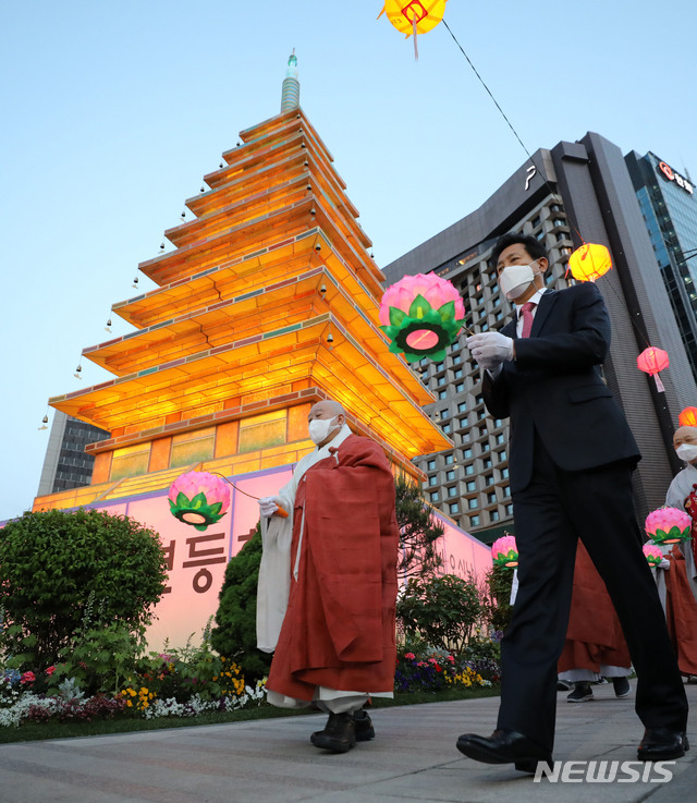 [서울=뉴시스]박주성 기자 = 불기 2565(2021)년 부처님 오신날을 앞두고 28일 오후 서울시청앞 광장에서 열린 봉축 점등식에서 조계종 총무원장 원행스님과 오세훈 서울시장 등 참석자들이 탑돌이를 하고 있다. 2021.04.28. [email protected]