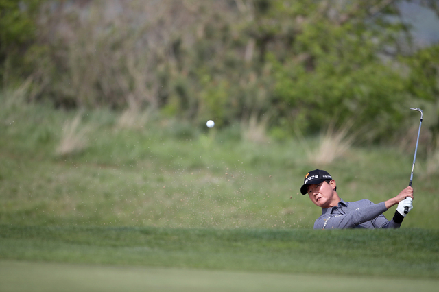 [서울=뉴시스]고범준 기자 = 29일 전라북도 군산에 위치한 군산CC에서 열린 KPGA 군산CC 오픈 1라운드 경기, 엄재웅이 11번홀에서 벙커샷을 치고 있다. (사진=KPGA 제공) 2021.04.29. [email protected] *재판매 및 DB 금지