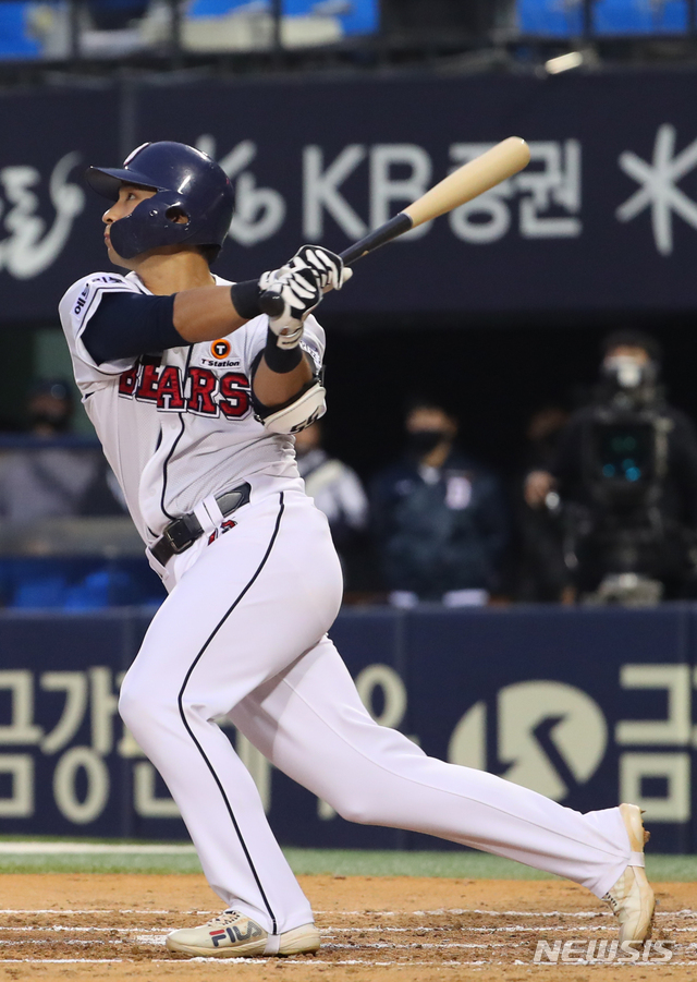 [서울=뉴시스]배훈식 기자 = 6일 오후 서울 송파구 잠실야구장에서 열린 2021 신한은행 SOL KBO리그 두산 베어스와 LG 트윈스의 경기, 3회말 음주사고 징계 후 753일만에 복귀한 두산 강승호가 첫 타석 초구를 통타해 추격 솔로포를 터뜨리고 있다. 2021.05.06. [email protected]