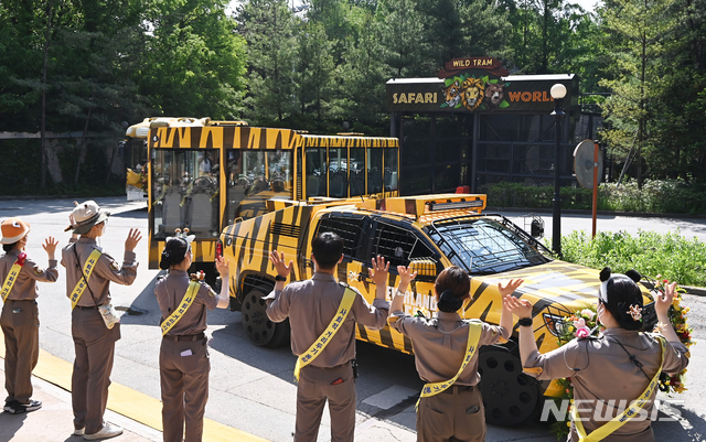 [용인=뉴시스]김종택기자 = 13일 오전 경기도 용인 에버랜드에서 '사파리월드 와일드 트램'이 새롭게 선보이고 있다. 사파리월드 와일드트램은 앞뒤 좌우 관람창 전체가 통창으로 만들어졌고 좌석에 앉았을 때 성인 평균 눈높이가 지상 1.6m로 설계돼 트램으로 다가오는 맹수들과 눈을 맞추며 가까이서 생생하게 관찰할 수 있다. 2021.05.13.